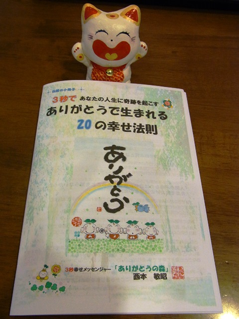 西本さん、「正観さんの小冊子」の紹介をありがとうございました。やっぱり、正観さんはいいですね。「ありがとうを言って一番豊かになり、得をするのはこの自分」…。分かりやすいです。色々な!?ストレス!?で体中が凝っている感じでしたが、この言葉で溶けてきました(笑)。今日は、より気合いを入れて「ありがとう」を言います!!いつもありがとうございます。 (文子さん)